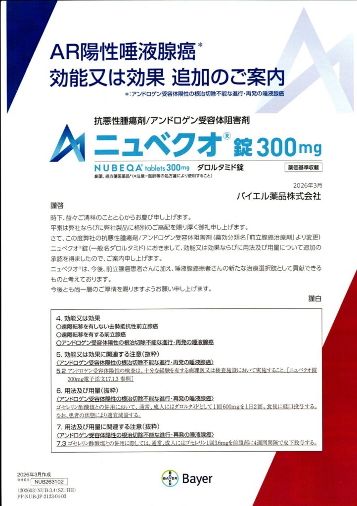 2026年3月23日、ニュベクオ錠300mg(一般名:ダロルタミド)に、アンドロゲン受容体(AR)陽性の根治切除不能な進行・再発の唾液腺癌という新しい適応が追加されました。